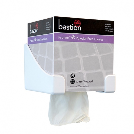 This wall-mounted plastic dispenser supports the Progenics Cuff-First glove boxes so that each glove can be pulled hygienically from the base. The Progenics Cuff-First dispensing system has proven to reduce wastage and improve overall hygiene.