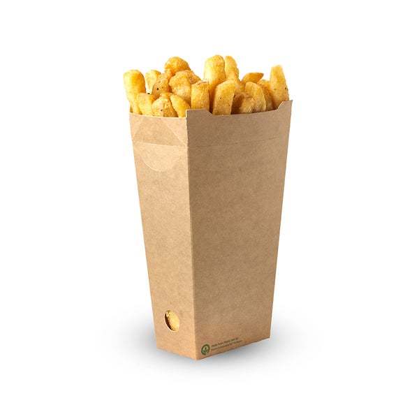 FSC™ certified Enclosed Chip Boxes have a self-closing lid that protects chips during transit. This functional secure design allows for efficient takeaway that avoids any spillage in takeaway bags. And the added benefit of ventilation holes prevents the chips from going soggy. Home compostable and recyclable if clean. Available in small & large