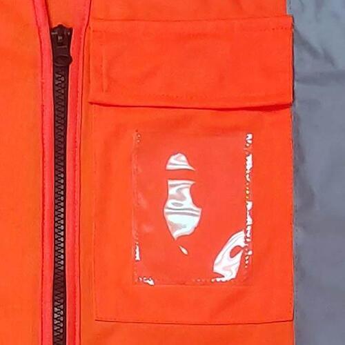 High visibility vest in fluorescent orange with an extra-long tail and additional reflective tape.