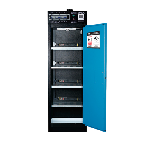 This 83L Single Door Lithium Ion Battery Storage Cabinet is designed for safe, smart Li-Ion battery charging, featuring a smart cooling system, double steel walls, four adjustable shelves with 20 plug sockets, and advanced safety features compliant with FM6050, OSHA, and NFPA standards.