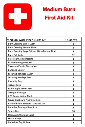 Burn Dressing 5cm x 15cm x 3, Burn Dressing 10cm x 10cm x 3, Burn Dressing Large 30cm x 40cm Face or Limb x 1, Burn Gel Sachet x 12, Petroleum Jelly Dressing x 1, Examination gloves pairs x 1, Tweezers Plastic Disposable x 1, Bandage Scissor x1, Securing Bandage 7.5cm x1, Securing Bandage 5cm x1, Clean Up Bag x1, Tissues Pack x 1, Fabric Tape 25mm x5m x 1, Triangle Bandage x 2, CPR Resuscitation Mask x 1, Gauze Swabs 2’s 7.5cm x 7.5cm x 4, Pack of Fabric Plasters standard 25's x 1, Cohesive Bandage Blue 5cm x 1, Safety Pins x 10, Heps/Aids Warning Label x 1, First Aid Tips x 1, Container Bag Or Box x 1